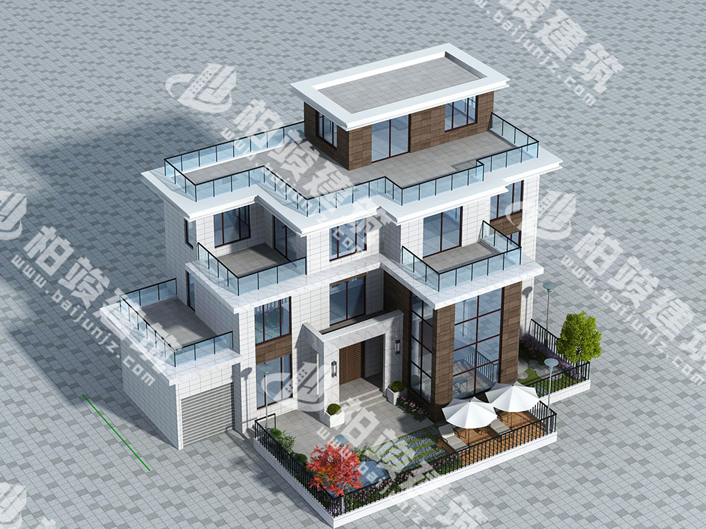 农村三层自建房设计图,现代感外形,平屋顶设计,带车库、5露台